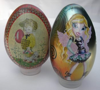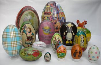 Aller Anfang ist leicht. Als ich 1984 dieses ausgefallene Sammelgebiet entdeckte, konnte ich auf Flohmärkten und Messen die in der Grösse eines Hühnereies weit verbreiteten Blechdöschen erstehen. Die Blechdosenfabrik Siegerist war ebenfalls ein ergiebiger Lieferant. Von Anfang an habe ich aber auch kleinere und grössere Blecheier in die Sammlung integriert, allerdings nicht konsequent. Trotzdem hat sich einiges angesammelt und ich habe mich deswegen entschieden, auf den Fotos immer auch das Zentimetermass abzubilden. |