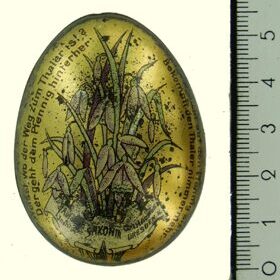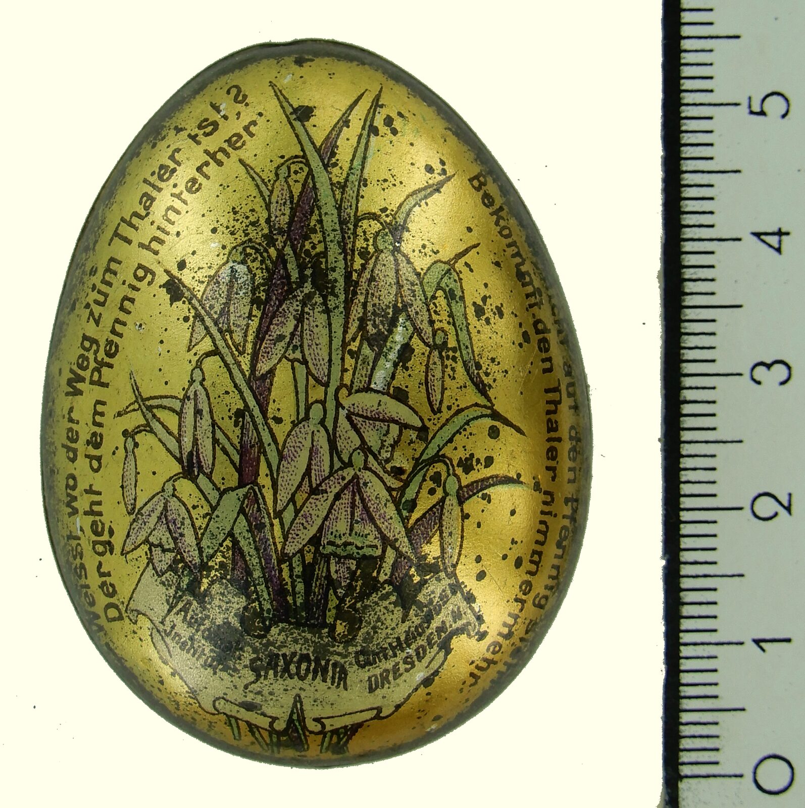 Vorderseite: Weisst, wo der Weg zum Thaler ist? Der geht dem Pfennig hinterher. Und wer nicht auf den Pfennig steht Bekommt den Thaler nimmermehr. Automat Institut Saxonia Curt Heinsius, Dresden N. Rückseite: Ob gross ob klein, ob arm ob reich, die Henne giebt stets Allen gleich. Automaten Institut "Saxonia" Dresden-N. |